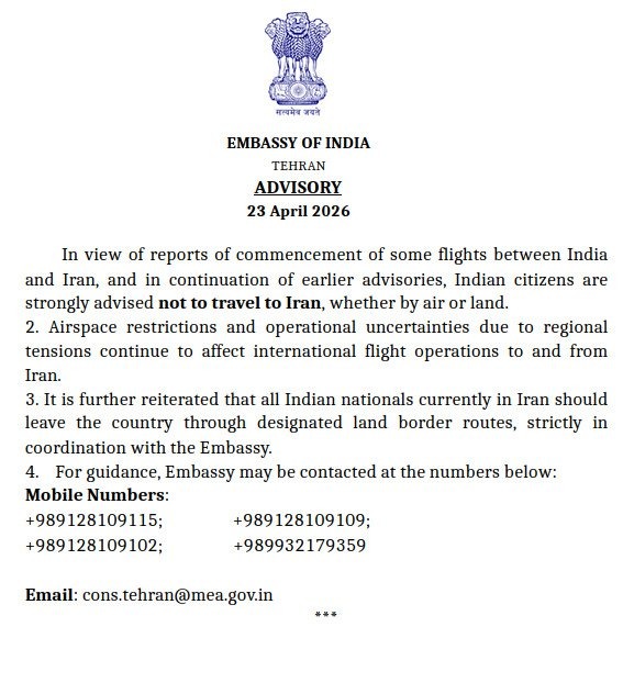 In the advisory dated April 23, 2026, the embassy stated that despite reports of limited flight operations between India and Iran, Indian nationals are strongly advised not to travel to Iran by air or land. The warning comes in continuation of earlier advisories issued in view of the volatile situation in the region.