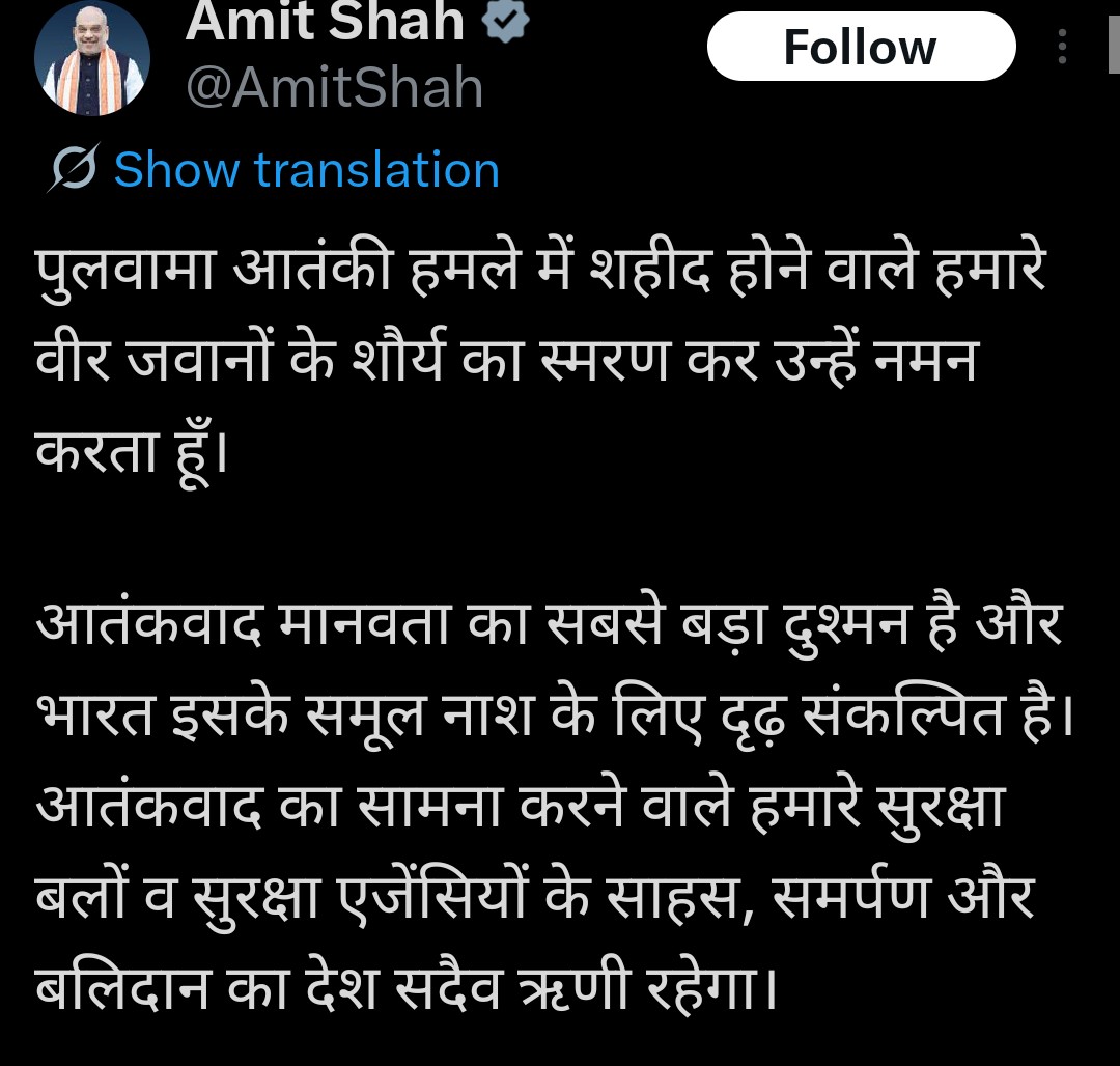 Union Home Minister and Minister of Cooperation Amit Shah paid homage to the soldiers who lost their lives in the Pulwama terrorist attack, remembering their bravery and sacrifice. In a message shared on the social media platform X, Shah honored the fallen personnel and described terrorism as the greatest enemy of humanity. He reiterated India’s firm commitment to eliminating the menace, stressing that the country remains determined in its fight against terror. The Home Minister emphasized that the courage, dedication, and selfless service of India’s security forces and agencies continue to inspire the nation. He noted that the country will always remain indebted to those who stand on the frontlines to safeguard citizens and uphold national security. Shah’s remarks came as the nation remembered the victims of the Pulwama attack, one of the deadliest assaults on Indian security forces. Leaders across the country have been paying tributes, highlighting the enduring legacy of the martyrs and the collective resolve to combat terrorism. The Pulwama tragedy remains a solemn reminder of the sacrifices made by security personnel in protecting the nation.