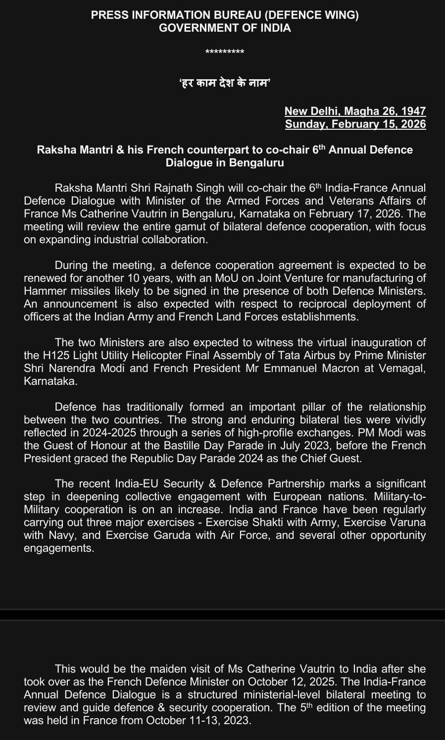 Bengaluru, February 17, 2026: India and France are set to further deepen their strategic partnership as Raksha Mantri Rajnath Singh co-chairs the 6th India–France Annual Defence Dialogue with France’s Minister of the Armed Forces and Veterans Affairs Catherine Vautrin in Bengaluru, Karnataka.