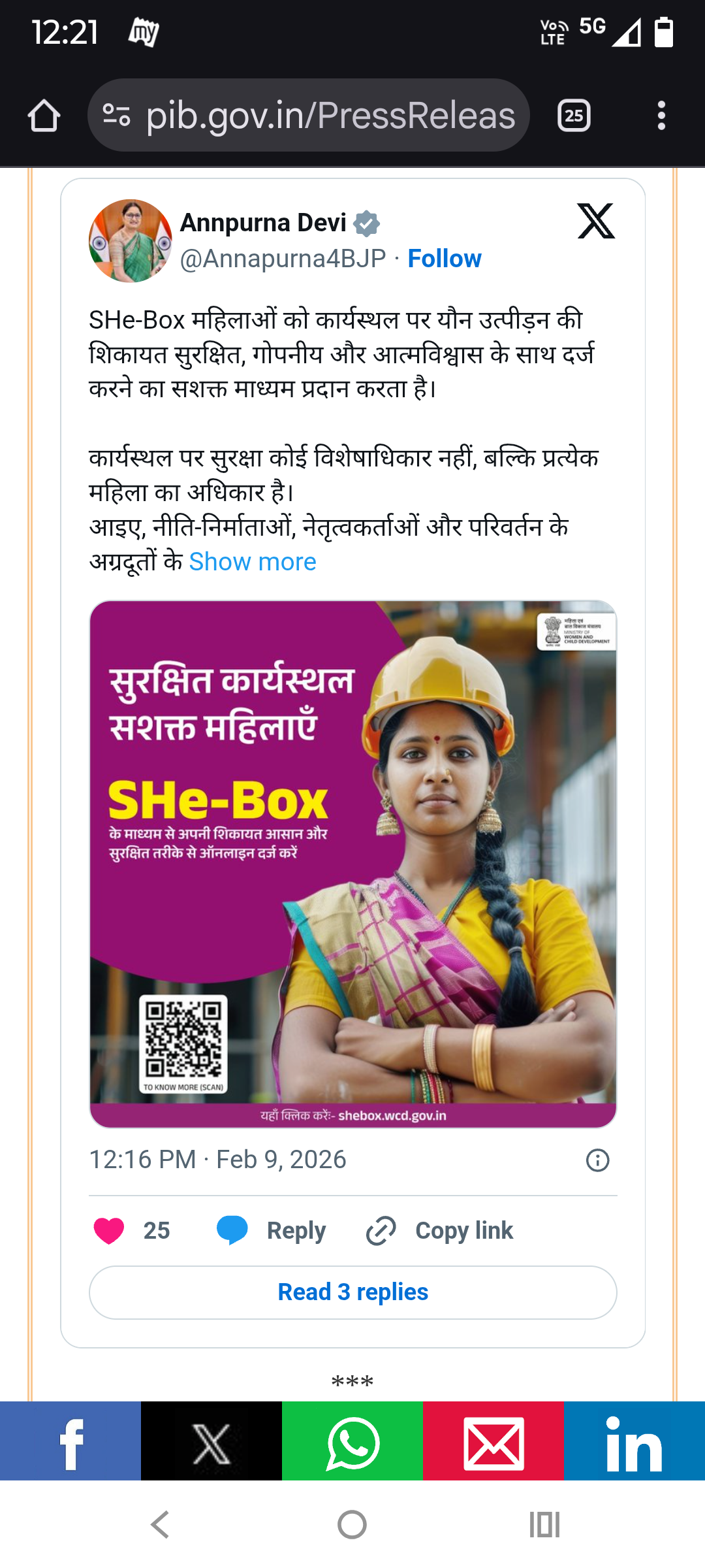 New Delhi, Feb 13, 2026: The Ministry of Women and Child Development will organise a National Conference on Safety of Women at Workplace (SHe-Box) on February 14, 2026, at Vigyan Bhawan, New Delhi. The conference aims to reinforce the Government’s commitment to ensuring safe, dignified, and harassment-free workplaces for women across sectors. The event will be attended by Union Minister for Women and Child Development Annpurna Devi, who will deliver the keynote address and administer the National Workplace Safety Pledge, along with Minister of State Savitri Thakur. Participants will include senior officials from Central Ministries, States and Union Territories, members of Internal and Local Committees, Nodal Officers, representatives from international organisations, industry leaders, civil society, and media. The conference will focus on strengthening the implementation of the Sexual Harassment of Women at Workplace (Prevention, Prohibition and Redressal) Act, 2013. It will also spotlight the SHe-Box portal, launched in August 2024 as a secure, multilingual, single-window platform for filing and tracking complaints with strict confidentiality. Key sessions will feature national and international roundtables on improving PoSH compliance and workplace culture, including discussions on challenges in the unorganised sector and global best practices. The programme will also witness the launch of the SHe-Box logo, PoSH training video, IEC materials, and a voluntary compliance checklist. Around 1,500 participants from over 100 organisations are expected to attend. The conference will be webcast live.