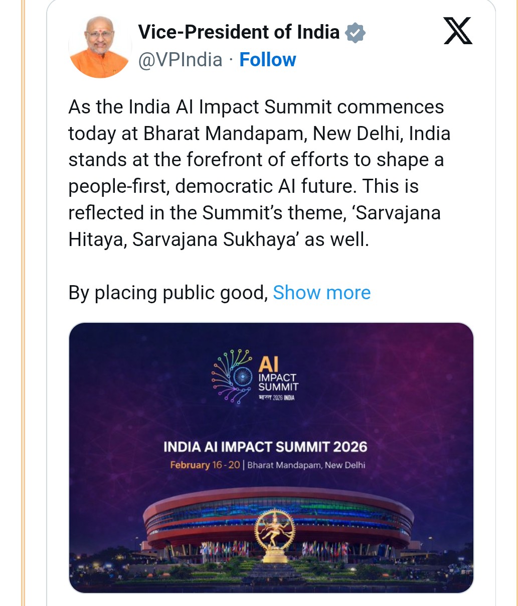 The Vice President of India, Shri C. P. Radhakrishnan, has conveyed his best wishes on the commencement of the India AI Impact Summit being held at Bharat Mandapam, New Delhi. In a message shared through social media, the Vice President highlighted India’s growing leadership in shaping a people-first and democratic future for artificial intelligence.