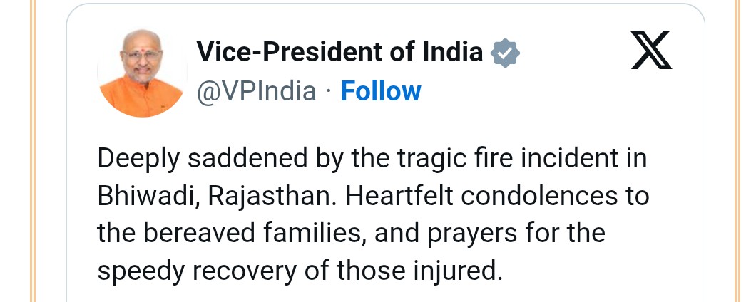 The Vice-President of India, C. P. Radhakrishnan, has expressed deep sorrow over the loss of lives in a tragic fire incident in Bhiwadi, Rajasthan.