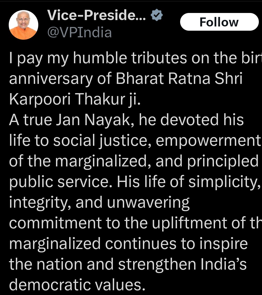 the Vice-President hailed Karpoori Thakur as a true ‘Jan Nayak,’ acknowledging his lifelong dedication to the empowerment of the underprivileged